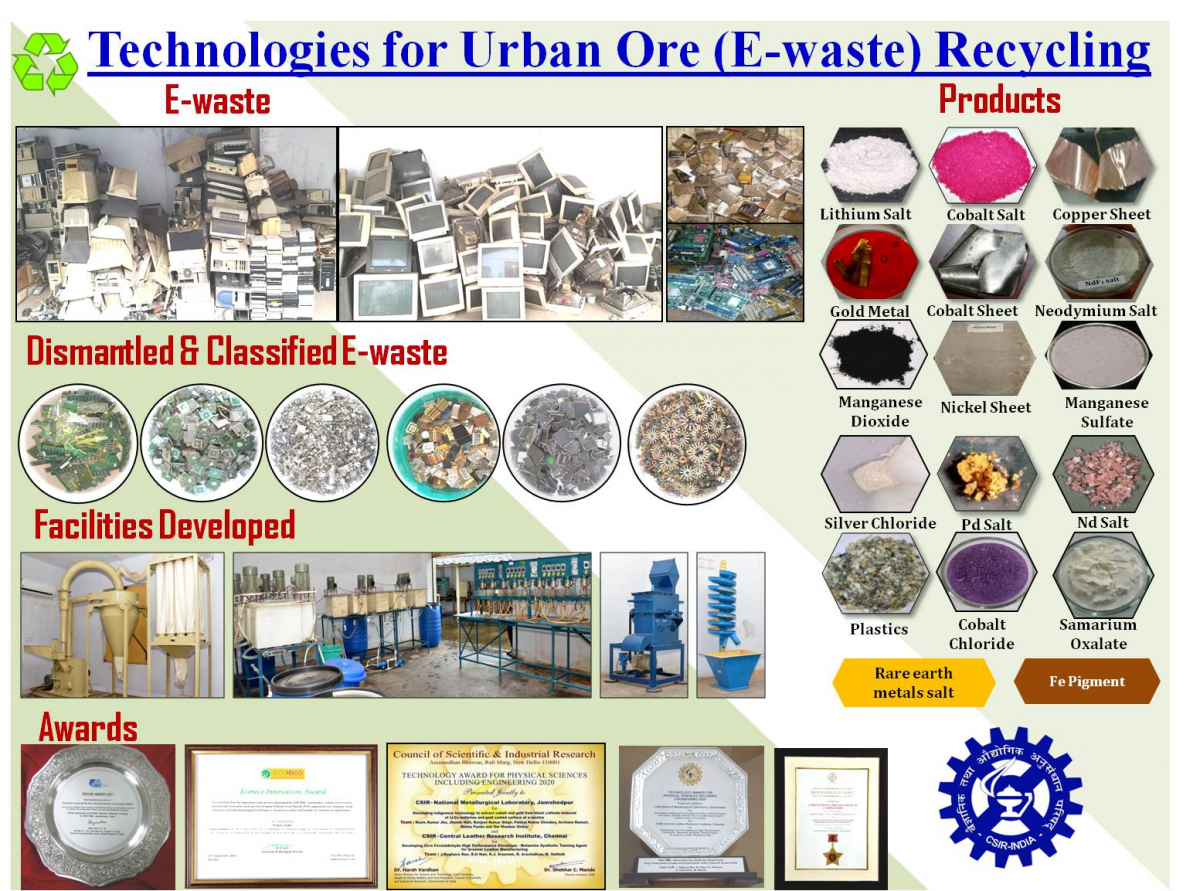 Under the banner of UORC, CSIR-NML has recently transferred e-waste recycling technologies to various industries (M/s Novasensa Pvt. Ltd., New Delhi., M/s Recyclib Pvt. Ltd., Delhi., M/s Metaore Recycler Pvt. Ltd., Kolkata., M/s NILE Li-Cycle Pvt. Ltd., Hyderabad., M/s Jai Mata Di Plastics, New Delhi., M/s Evergreen Recyclekaro Pvt. (India) Ltd., Mumbai; M/s EXIGO Recycling, New Delhi; M/s SBCON Recycling Pvt. Ltd., Ahmedabad; M/s ADV Metal Combine Pvt. Ltd., Durg; M/s UNQ IND Pvt. Ltd., Firozabad; M/s Eco Recycling Company, Mumbai) for the recovery of rare, rare-earth, precious and strategic metals. This initiative will create self-employment, entrepreneurship and promote cottage industries. In this pursuit, scientists from CSIR-NML have been conferred several awards including CSIR Technology award (2021), NM Sampat Award (2021), RECOM Award (2012), etc.