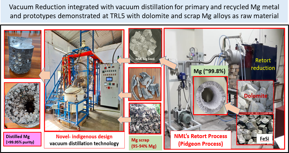 During 2000-2017, CSIR-NML started development of Electrothermal pilot plant with liquid state silicothermic reduction technologies. Since 2020, CSIR-NML re-visited its Pidgeon/Retort process and a single retort prototype for 14-15 kg feed/charge and 2.5-3.0 kg Mg metal is being successfully established. For refining Mg and scrap-recycling, vacuum distillation-based technologies were developed with indigenous equipment-designs.