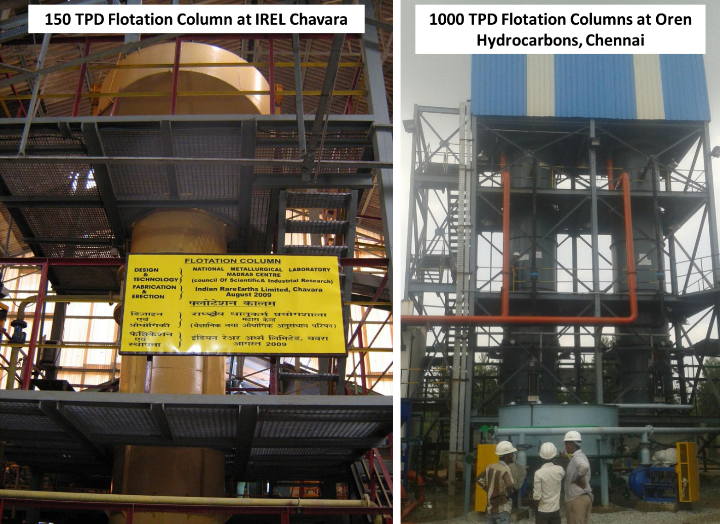 CSIR - National Metallurgical Laboratory (CSIR-NML) has been at the forefront of indigenizing the ‘Column Flotation Technology’ for processing lean grade and fine-grained ores for over three decades. Laboratory-scale (74 mm diameter) and Pilot plant-scale (500 mm diameter) flotation columns were designed, fabricated, and field-tested at various private and public sector mineral processing industries nationwide. Development of column flotation technology achieved Technology Readiness Level - 9, implying that it is ready for successful deployment at a commercial scale. The USP of CSIR - NML is that it provides a one-stop solution for the installation and commissioning of commercial-scale flotation columns by collaborating and partnering with an EPC company, M/s Tega McNally Minerals Limited, Bengaluru, and reagents manufacturers and suppliers, M/s Sudarshan Chemical Industries Limited, Pune. So far, five laboratory-scale, two pilot plant-scale, and eight commercial-scale flotation columns have been commissioned to beneficiate limestone, barite, and fine coal recovery.