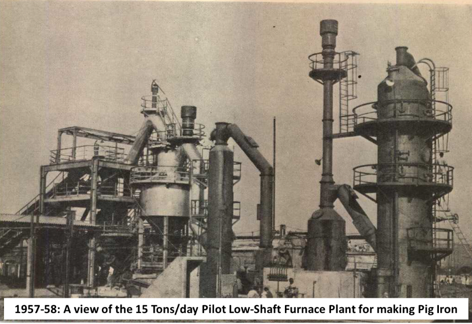 A 15-tonne/day pilot low-shaft furnace, one of the largest pilot plants established anywhere in the world, was operational at NML since 1959. The plant, costing close to 3 million (in mid-1950s) and supplied by the Demag-Humboldt Niederschachtofen, Duisburg, West Germany took nearly two years for construction. It required 100 tonnes of materials handling per day! The objective of having the plant was to assess the possibilities of making commercial grades of pig iron with raw materials like soft iron ores, iron ore fines, beneficiated magnetite iron ore, with various non-coking high ash coals or carbonized lignite, plentiful supplies of which exist in India but unsuitable for exploitation in conventional blast furnaces. This plant yielded the first pig iron in India from iron ore fines and coal with over a thousand tons of foundry grade pig iron was produced in 1959 itself. There were five phases of trials: 1) Use of low grade ores and coal; 2) Charge of self-fluxing briquettes from iron ore fines, limestone and non-coking coals; 3) Utilization of carbonized lignite from Neyveli & Palamu & utilisation of Salem magnetite; 4) Improving fuel economy through top gas injection, sintered burden and oxygen enrichment of blast and 5) Production of ferro-alloys such as Fe-Mn and Fe-Cr. More than seventy campaigns were conducted over two decades on round the clock basis to establish technical and economic feasibility of producing pig iron using raw materials from all across the country. The results of these studies, which were carried out under a large number of sponsored studies, notably from the state governments of East Punjab, Andhra Pradesh, Rajasthan, Maharashtra, Tamil Nadu and Bihar were used for the establishment of small units for iron and steel production in different parts of India. Government of Nepal sponsored a study to establish a small-scale iron production facility using their raw materials. Pilot scale tests in the low shaft furnace were also conducted on smelting of manganese ores to produce ferromanganese, titaniferous ores for TiO2 slag and phosphate ore for ferro-phosphorous.